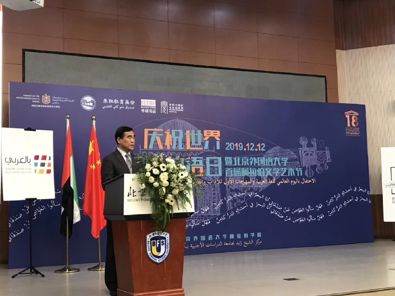أقيم الاحتفال باليوم العالمي للغة العربية والمهرجان الأول للآداب والفنون العربية لجامعة الدراسات الأجنبية ببكين يوم الخميس في مركز الشيخ زايد لدراسة اللغة العربية والدراسات الإسلامية في جامعة الدراسات الأجنبية ببكين بتنظيم مشترك من سفارة دولة الإمارات العربية المتحدة في بكين ومركز الشيخ زايد في جامعة الدراسات الأجنبية ببكين، بالتعاون مع “لجنة تنظيم موسم القراءة” في بكين، و”مكتبة بحث وتعليم اللغات الأجنبية”، و”صندوق التعليم” – تشو كاي.