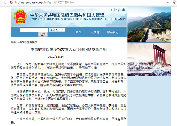 أدلى المتحدث باسم سفارة جمهورية الصين الشعبية في لبنان بتصريح حول شينجيانغ هذا نصّه:
