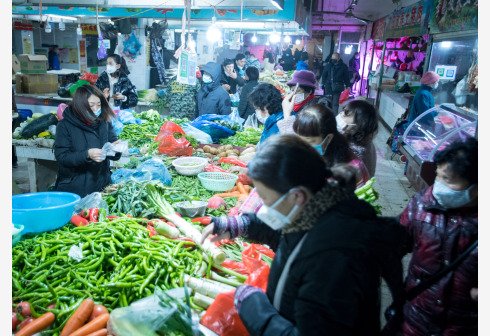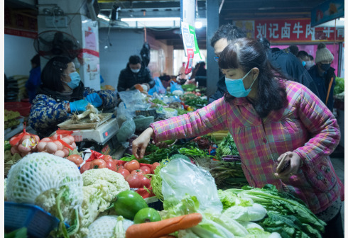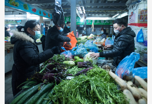 ووهان 23 يناير 2020 (شينخوا) في الصور الملتقطة يوم 23 يناير 2020، مواطنون يرتدون كمامات الوجه وهم يشترون الخضراوات في سوق محلي في مدينة ووهان حاضرة مقاطعة هوبي بوسط الصين، استعدادا للاحتفال بالسنة الصينية الجديدة.