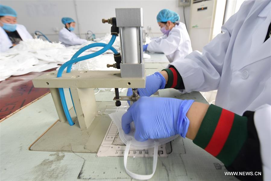 مجموعة صور لعمال يعملون في ورشة لشركة كمامات طبية في مدينة تانغشان بمقاطعة خبي، شمالي الصين. ومن أجل التعامل مع وباء الالتهاب الرئوي الناجم عن فيروس كورونا الجديد، سارع عمال العديد من شركات المواد الطبية في الصين إلى العمل لإنتاج معدات واقية مثل الملابس الواقية والأقنعة لضمان إمدادات المواد.
