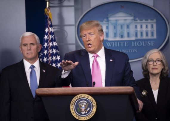 الرئيس الأمريكي دونالد ترامب يتحدث خلال مؤتمر صحفي عُقد في البيت الأبيض بالعاصمة واشنطن في 26 فبراير 2020. وقد قام ترامب يوم الأربعاء بتعيين مايك بنس مسؤولا عن ملف استجابة البلاد لتفشي فيروس كورونا الجديد.