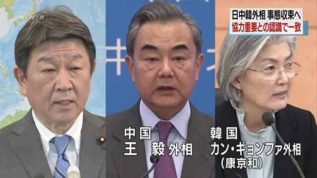 وجاء الاجتماع بمبادرة من الجانب الصيني، وحضره عضو مجلس الدولة ووزير الخارجية الصيني وانغ يي، ووزيرة خارجية جمهورية كوريا كانغ كيونغ-وها، ووزير الخارجية الياباني توشيميتسو موتيجي.