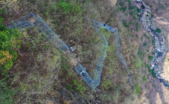 في الصورة الملتقطة يوم 13 مايو 2020، مشهد جوي للسلم الحديدي الذي تم تركيبه على الجرف لربط قرية آتولير بالعالم الخارجي في محافظة تشاوجيوي بولاية ليانغشان ذاتية الحكم لقومية يي بمقاطعة سيتشوان جنوب غربي الصين.