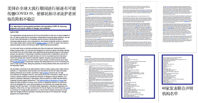 تظهر الصورة بيانا مشتركا صادرا عن 60 مؤسسة حول العالم تدين طرد الولايات المتحدة للمهاجرين غير الشرعيين خلال فترة الوباء