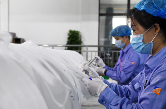 فى الصورة الملتقطة فى 14 مايو فى مدينة بينغدينغشان بمقاطعة خنان بوسط الصين، عمال يفحصون منسوجات طبية خاصة للعينات المتبقية فى ورشة صينية