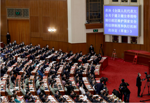 وقد صوت نواب المجلس الوطني الـ13 لنواب الشعب الصيني الذين حضروا الاجتماع الختامي لدورته السنوية الثالثة، بأغلبية ساحقة للموافقة على قرار المجلس لتأسيس وتحسين النظام القانوني وآليات إنفاذ القانون في هونغ كونغ لحماية الأمن الوطني.