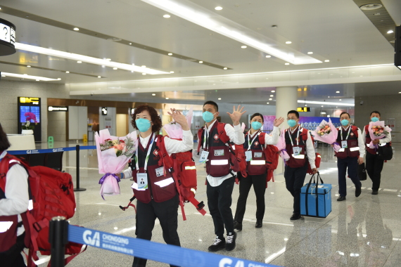 أعضاء فريق الخبراء الطبيين الصينيين يصلون إلى مطار جيانغبي الدولي في بلدية تشونغتشينغ بجنوب غربي الصين، 18 يونيو 2020.