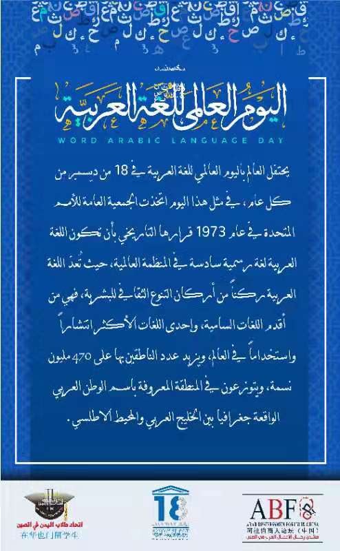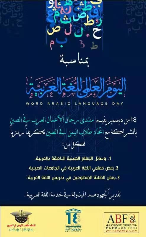 نظم اتحاد طلاب اليمن في الصين بالشراكة مع منتدى رجال الأعمال العرب في الصين حفلا يوم الجمعة لإحياء اليوم العالمي للغة العربية والذي يصادف يوم الـ18 من ديسمبر كل عام، وللاحتفاء بدور الجهات الصينية والمتخصصين الصينيين المعنيين في خدمة اللغة العربية.