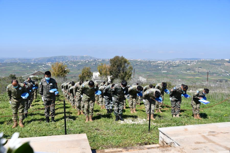 وضع أفراد من الدفعة التاسعة عشرة من قوات حفظ السلام الصينية في لبنان، إكليلا من الزهور تكريما للشهداء بمن فيهم دو تشاو يو، بمناسبة مهرجان تشينغمينغ (يوم زيارة قبور الأسلاف، أو يوم الصفاء والنقاء، التقليدي في الصين)، بمنطقة الخيام في لبنان، يوم 4 أبريل 2021.