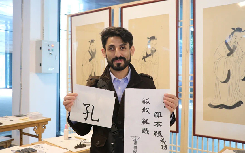 الطالب المصري ناجح ابراهيم يعرض عمله في فن الخط الصيني