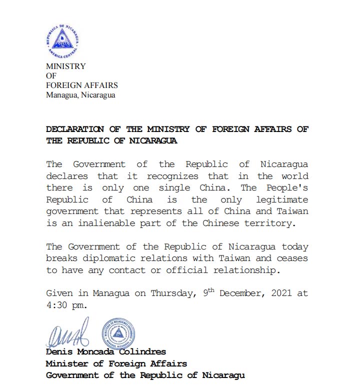 وقال الإعلان إن “حكومة جمهورية نيكاراغوا تقطع اليوم العلاقات الدبلوماسية مع تايوان وتوقف أي اتصالات أو علاقات رسمية”.