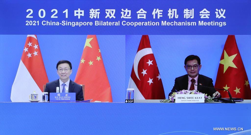 وقال هان إن الصين ترحب بمشاركة سنغافورة العميقة في عملية تعزيز نموذج تنموي جديد، وهي على استعداد للعمل مع سنغافورة لتعزيز التعاون عالي الجودة في إطار الحزام والطريق، وحماية التعددية والتجارة الحرة، ودعم التعاون في مكافحة الجائحة، وتوسيع التعاون بنشاط في مجالات الاقتصاد الرقمي والتنمية الخضراء، من بين أمور أخرى.