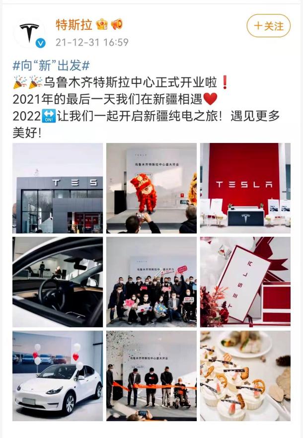 في اليوم الأخير من عام 2021، تم افتتاح أول صالة عرض لسيارات ” تسلا” في منطقة شينجيانغ رسميًا. وقد جذب إعلان شركة ” تسلا ” عن الخبر على صفحتها الرسمية على ويبو اهتمامًا كبيرًا من العالم الخارجي.