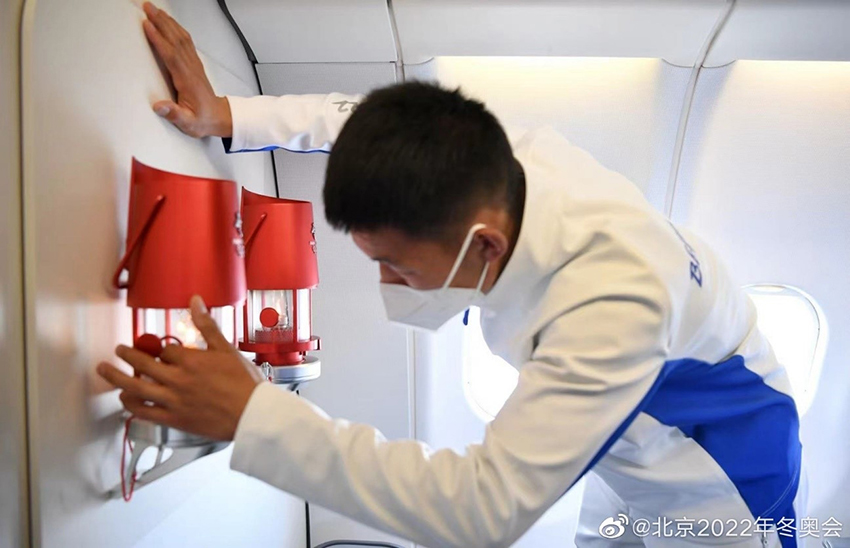تم نقل شعلة دورة الألعاب الأولمبية الشتوية بواسطة طائرات مستأجرة تابعة لشركة الخطوط الصينية، ورافقها حراس إخصائيون على متن الطائرة، يعتمد فانوس اللهب على هيكل مثبت على الحائط ويتم وضعه في مقدمة الطائرة. وتناوب أربعة حراس على حماية الشعلة. كما تناوب مهندسان على تقديم الدعم الفني لضمان بقاء الشعلة ملتهبة إلى غاية وصولها إلى بكين.