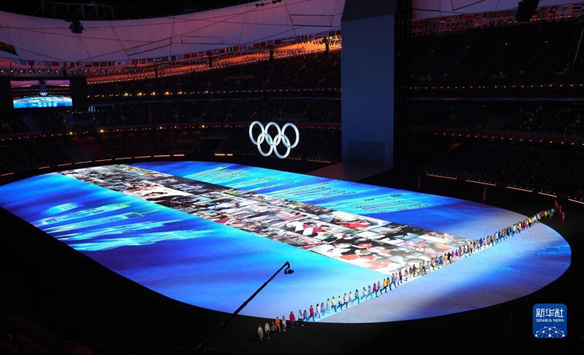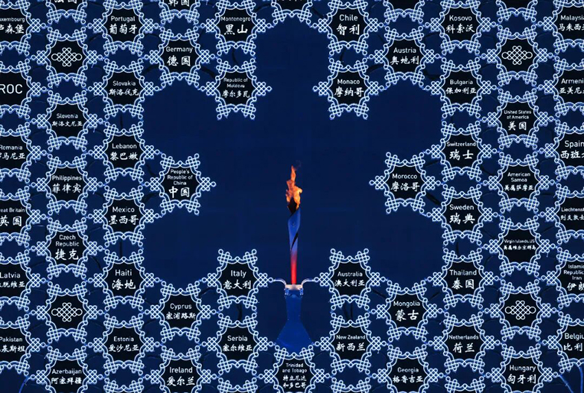 لقد ظهرت على التوالي أسماء المدن المضيفة للألعاب الأولمبية الشتوية الـ 23 الماضية في مكعبات الثلج المنقوشة بالليزر، وأخيرا ظهرت “بكين 2022”. ثم قام لاعبوا هوكي الجليد بضرب الكرة الجليدية لتصطدم مع مكعب الجليد، الذي أخرج من داخله الحلقات الخمس الجليدية. إن “كسر الجليد” يعني تحطيم الحواجز، وتقريب الناس من بعضهم البعض، والتحول إلى مجتمع واحد متناغم.