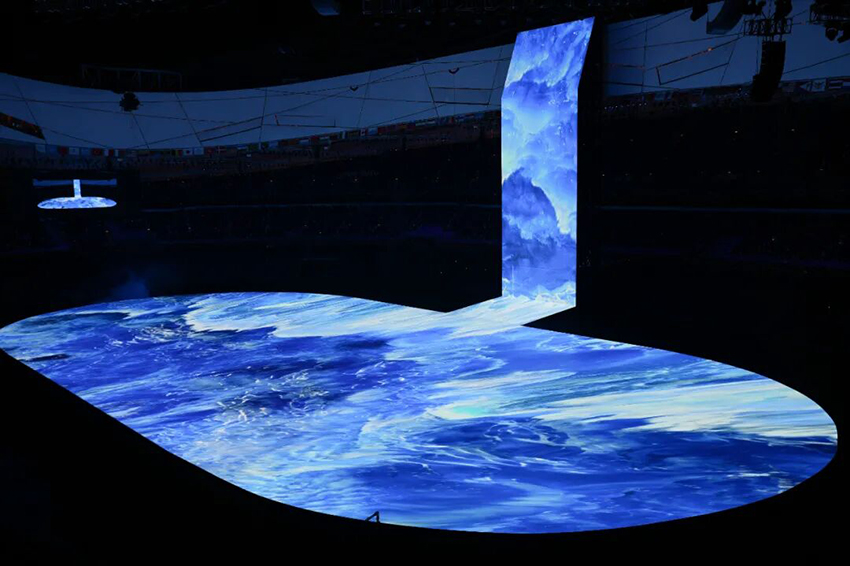 في حفل الافتتاح، سقطت قطرة من الحبر الأزرق الجليدي من السماء وتحولت إلى مياه النهر الأصفر التي تساقطت وغطت المكان بأكمله مستنسخة بذلك مقولة الشاعر الصيني الشهير ليباي التي قال فيها “مياه النهر الأصفر هبة السماء”.