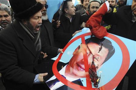 واحرق المحتجون الذين كانوا يلوحون بأعلام تركستان الشرقية علما صينيا وصورة لتشي قبل ان تتدخل الشرطة لتفريقهم.