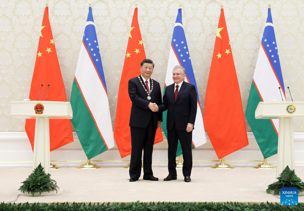 تسلم الرئيس الصيني شي جين بينغ وسام الصداقة من الرئيس الأوزبكي شوكت ميرضيائيف هنا يوم (الخميس).