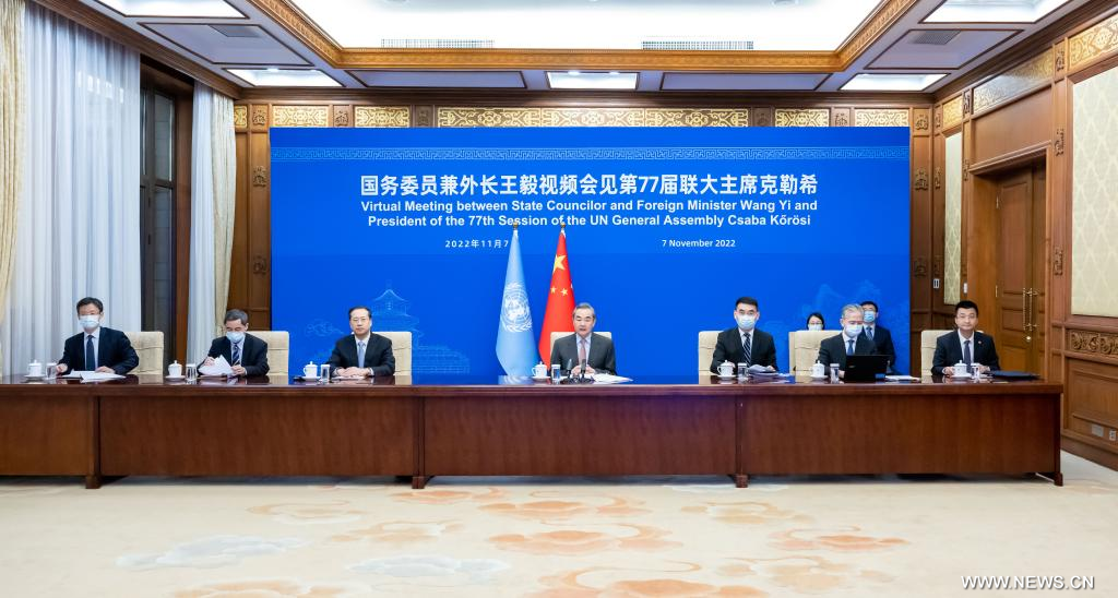 التقى عضو مجلس الدولة وزير الخارجية الصيني وانغ يي يوم (الاثنين) عبر رابط فيديو مع تشابا كوروشي، رئيس الدورة الـ77 للجمعية العامة للأمم المتحدة.