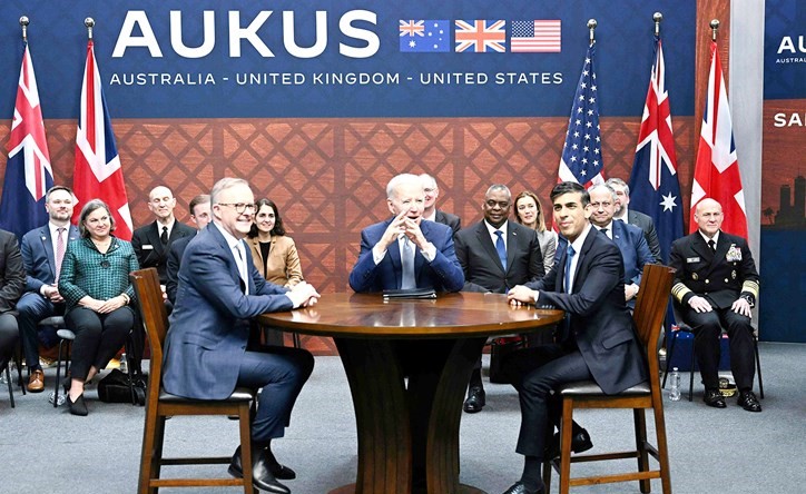 وفقا للتقارير، أعلنت الولايات المتحدة والمملكة المتحدة وأستراليا في 14 مارس/ آذار مسار التعاون في مجال الغواصات النووية بين الدول الثلاث. وقالت الدول الثلاث إنها ملتزمة بضمان الوفاء بأعلى معايير حظر الانتشار النووي، وستتفاوض مع الوكالة الدولية للطاقة الذرية بشأن ترتيبات الضمانات.