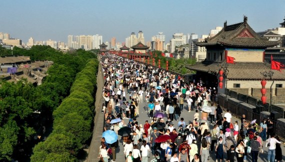 زوار في موقع الجذب السياحي “سور مدينة شيآن” في مدينة شيآن، حاضرة مقاطعة شنشي بشمال غربي الصين، حيث شهد الموقع إقبالا كبيرا من الزوار خلال اليوم الثاني من عطلة عيد العمال التي تستمر خمسة أيام.