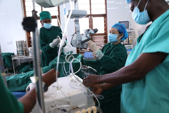 طبيبة العيون دونغ لي لي (الثانية من على اليمين)، وهي عضو بالفريق الطبي الصيني الـ32 إلى زنجبار، تستعد لإجراء عملية مع زملائها المحليين في مستشفى منازي موجا في زنجبار بتنزانيا، 23 فبراير 2023. (شينخوا)