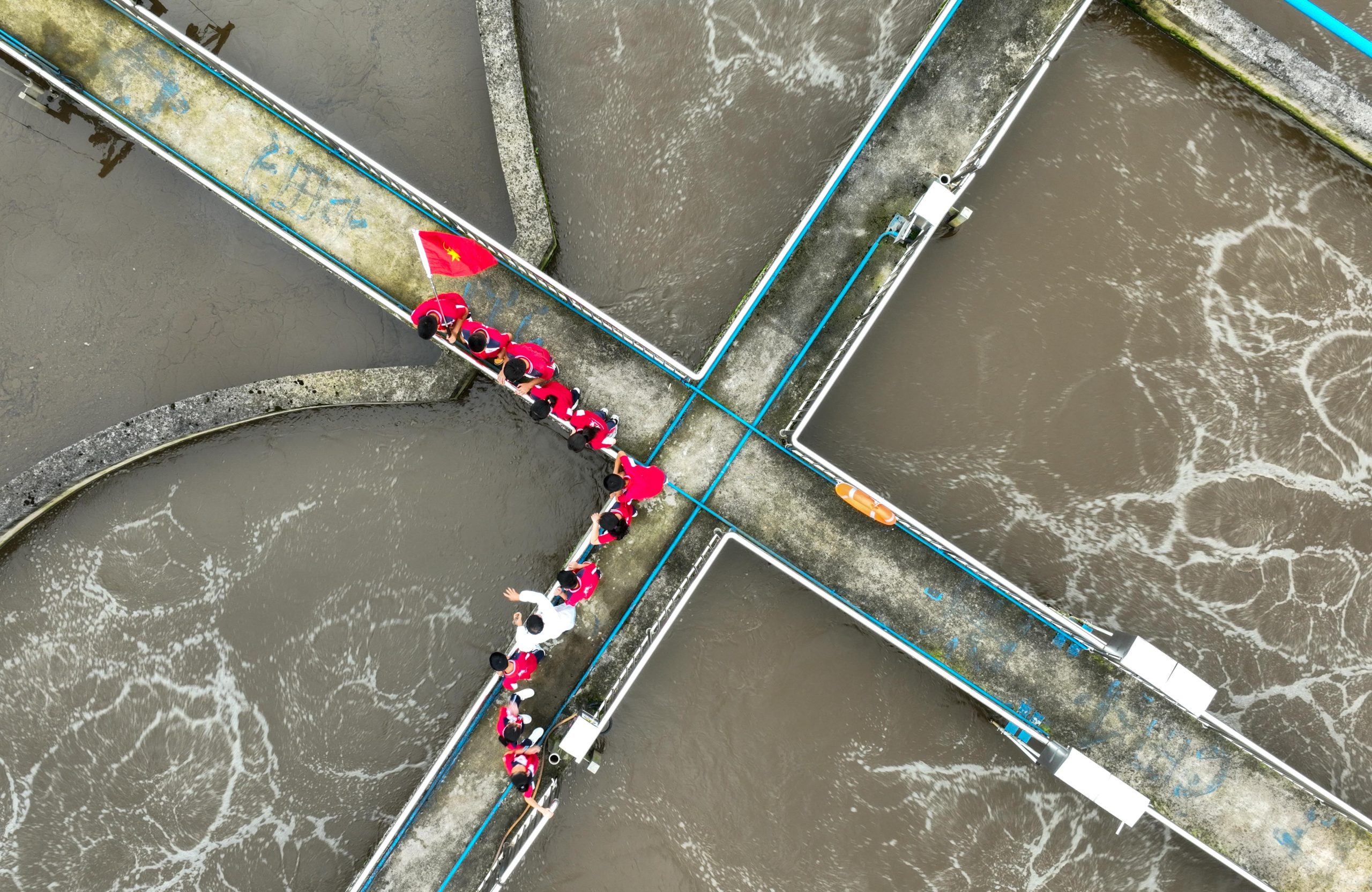 في الصورة الملتقطة بواسطة طائرة مسيرة، طلاب يزورون محطة معالجة مياه الصرف الصحي بمحافظة كاييانغ في مقاطعة قويتشو بجنوب غربي الصين.