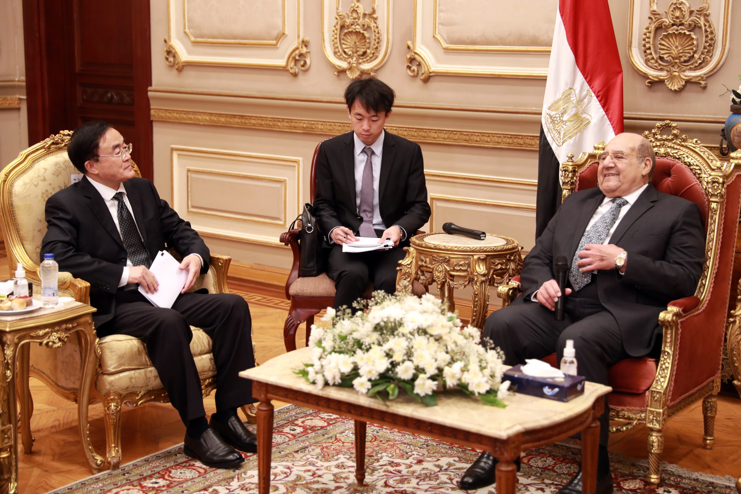 في الصورة الملتقطة، تشيوي تشينغ شان (يسار)، عضو اللجنة المركزية للحزب الشيوعي الصيني ورئيس معهد تاريخ وأدبيات الحزب التابع للجنة المركزية للحزب الشيوعي الصيني، يلتقي مع رئيس مجلس الشيوخ المصري رئيس حزب مستقبل وطن عبد الوهاب عبد الرازق في العاصمة المصرية القاهرة.