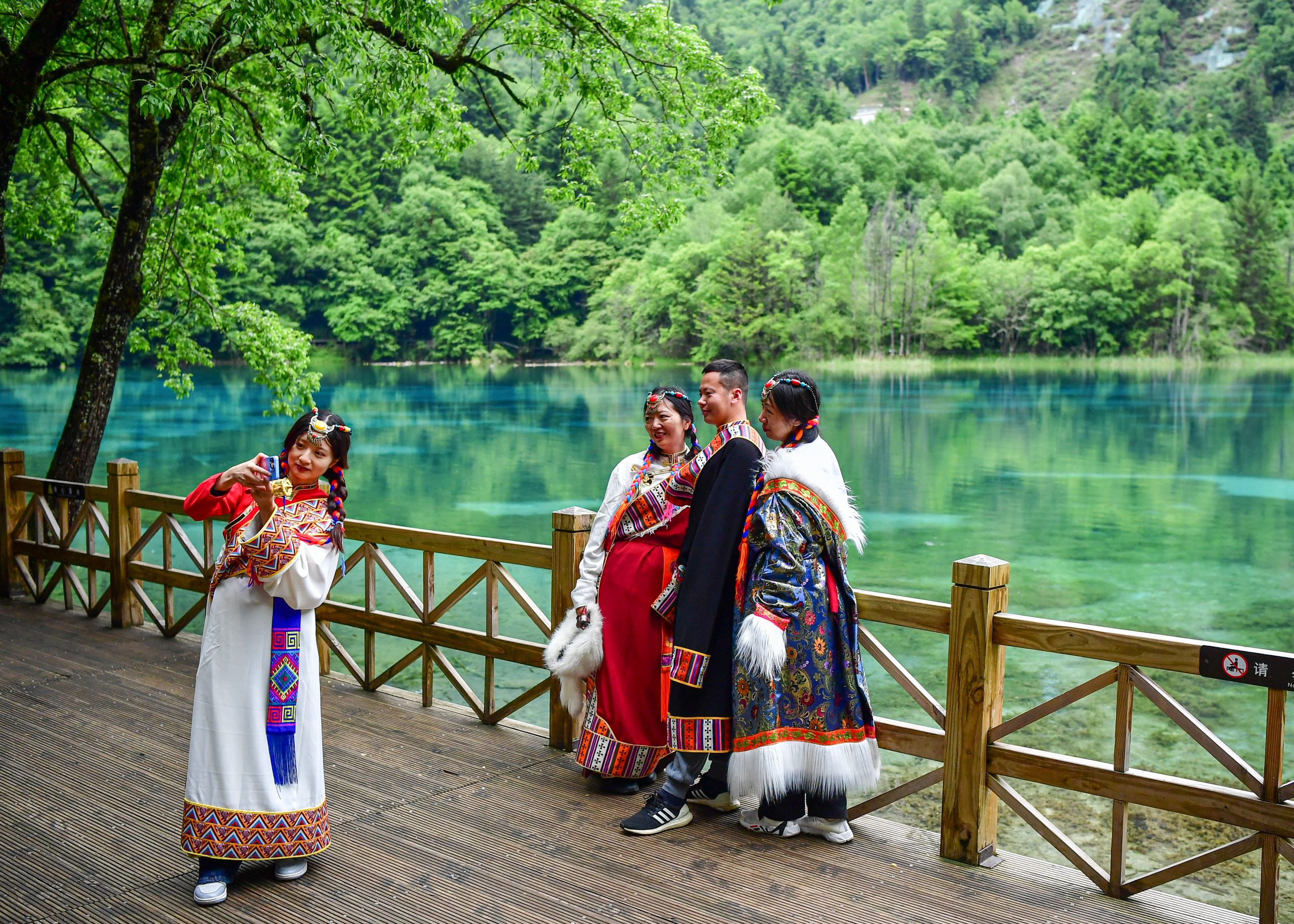 في الصورة الملتقطة، زوار يتمتعون بمناظر طبيعية خلابة في منطقة جيوتشايقو السياحية بمقاطعة سيتشوان بجنوب غربي الصين، والتي تعد أحد مواقع التراث الطبيعي العالمي. وقد استقبلت المنطقة السياحية الشهيرة أكثر من 1.2 مليون زائر حتى يوم 8 يونيو في عام 2023.