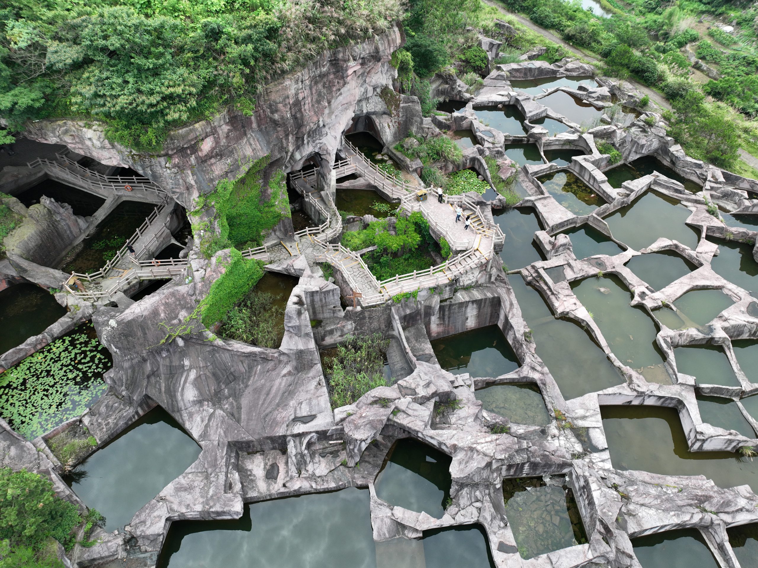 في الصورة الملتقطة بواسطة طائرة مسيرة، سياح يزورون منطقة سياحية تحولت من محجر مهجور في جزيرة شهبان في محافظة سانمن بمقاطعة تشجيانغ في شرقي الصين.