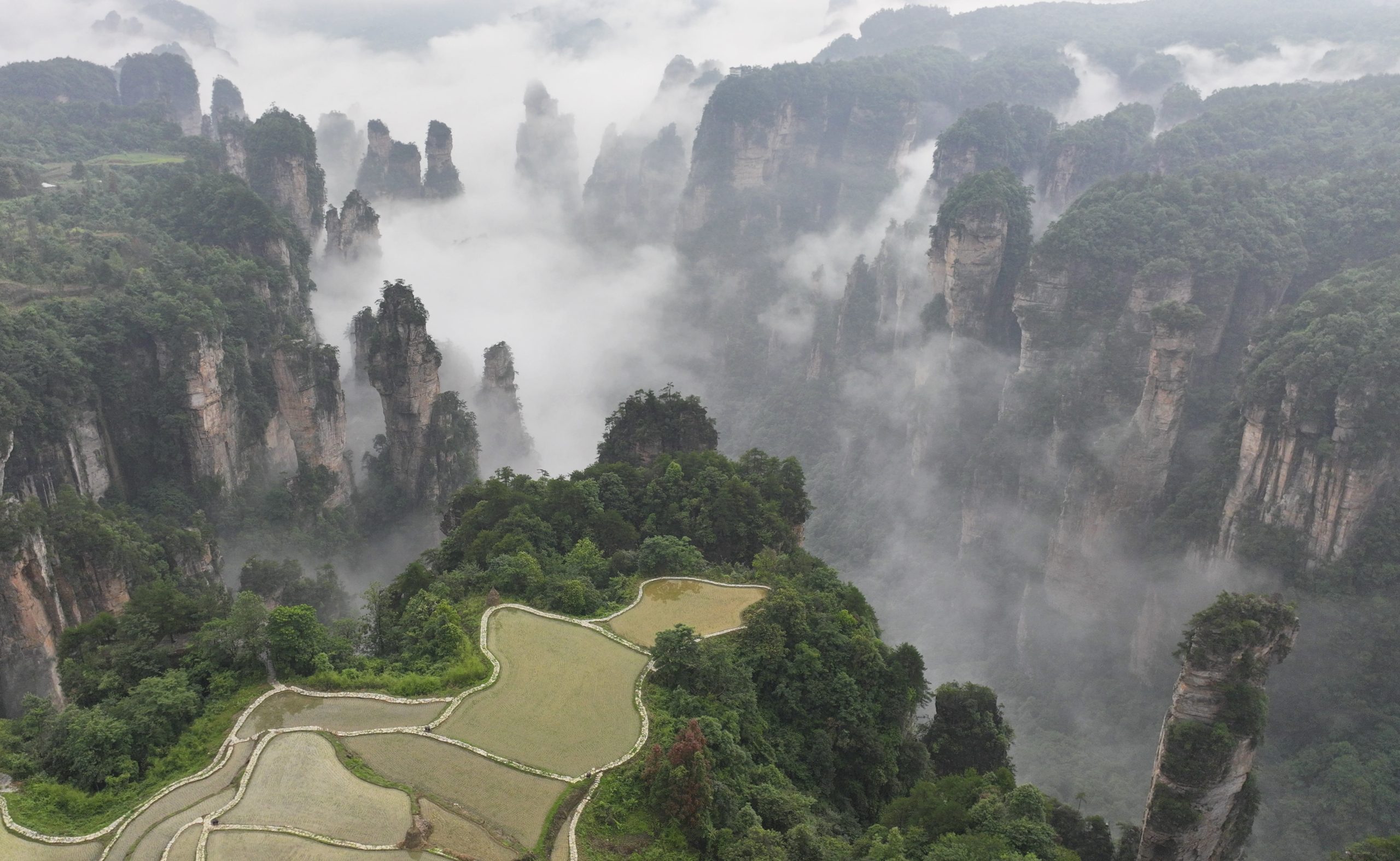 في الصورة الملتقطة، منظر جوي خلاب لجبال تيانتسيشان في حديقة تشانغجياجيه الوطنية للغابات في مقاطعة هونان بوسط الصين، حيث تشهد المنطقة هطولا مستمرا للأمطار في الأيام الأخيرة، لتشكل الغيوم المنتشرة بين القمم الشاهقة منظرا طبيعيا فريدا.