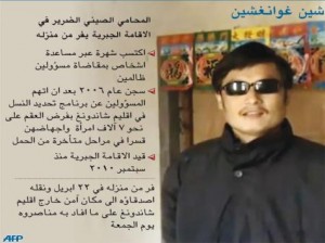 ويعتبر غوانغشينغ أحد أبرز المعارضين السياسيين الصينيين، وقد استطاع الأسبوع المنصرم -وبمساعدة شبكة سرية من الأعوان- الإفلات من قبضة الحراسة المفروضة عليه من السلطات الصينية في محبسه، واستطاع بعد هروبه قطع مسافة 480 كلم للوصول إلى العاصمة الصينية بكين، حيث يعتقد أنه لجأ إلى السفارة الأميركية هناك، الأمر الذي وضع السلطات الصينية في موقف محرج.