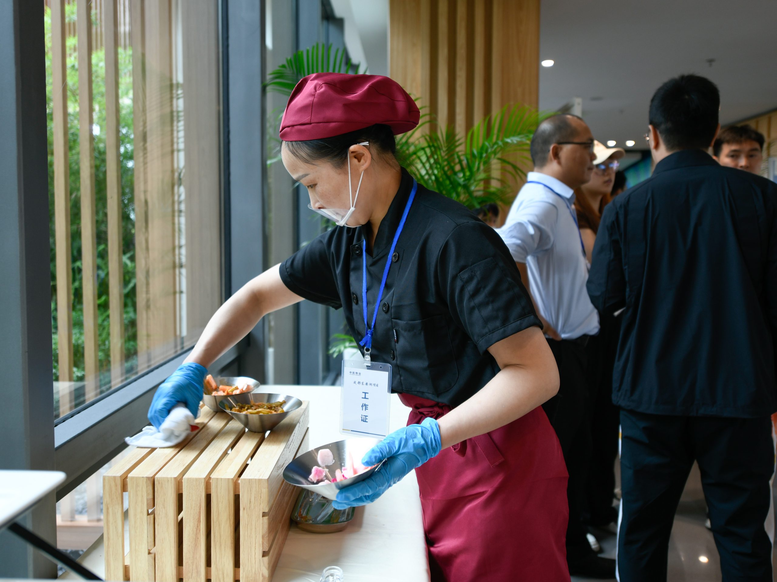 في الصورة الملتقطة، موظفة تعمل في منطقة تناول الطعام بالمركز الإعلامي الرئيسي لدورة الألعاب الجامعية العالمية في مدينة تشنغدو، حاضرة مقاطعة سيتشوان بجنوب غربي الصين. ويقع المركز الإعلامي الرئيسي بالقرب من حديقة بحيرة دونغآن الرياضية حيث سيُقام حفل افتتاح دورة الألعاب الجامعية العالمية. ويضم المركز المذكور المركز الصحافي الرئيسي ومركز البث الدولي.
