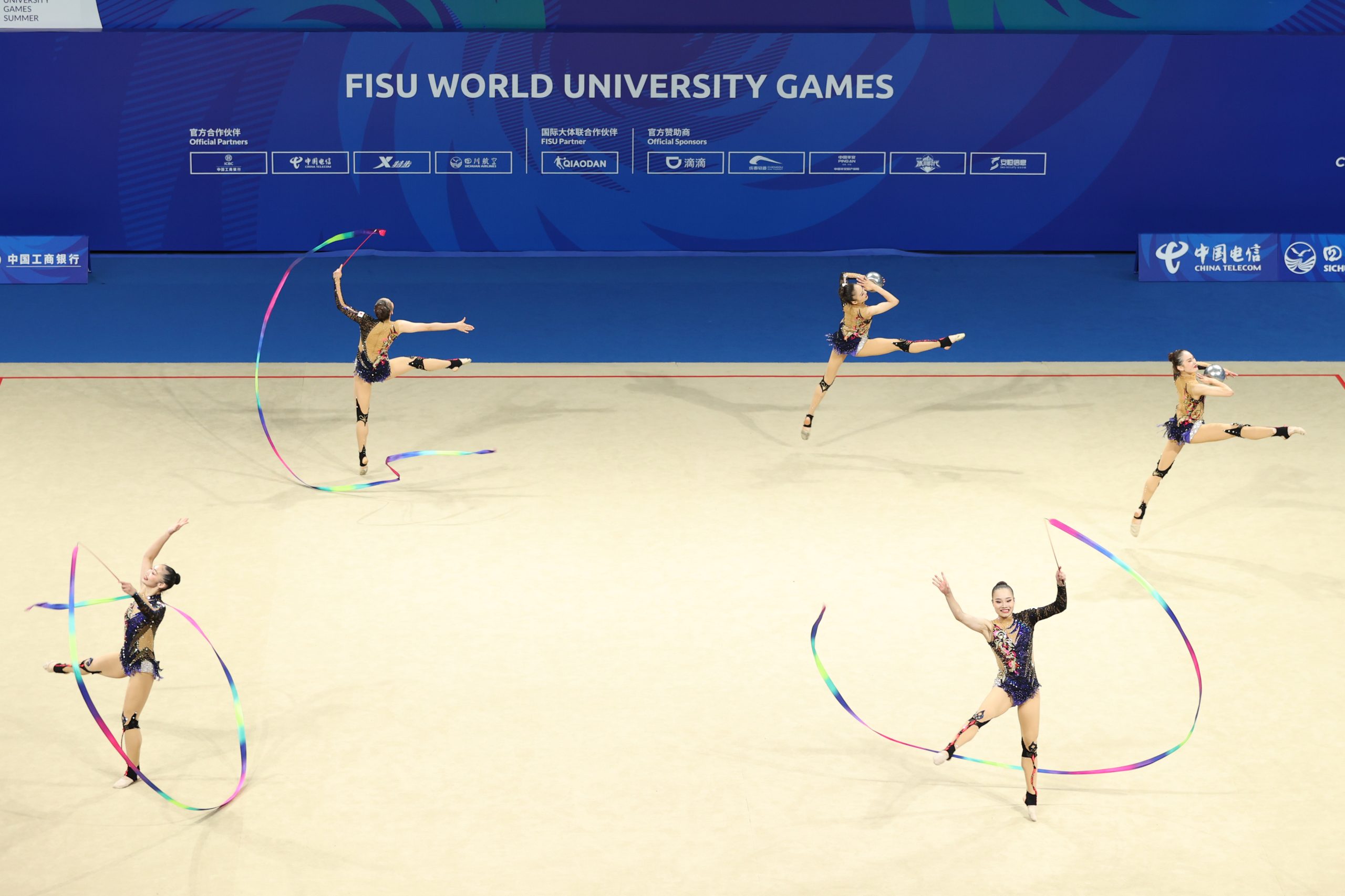 في الصورة الملتقطة فريق اليابان يشارك في المسابقة العامة للفرق في الجمباز الإيقاعي في النسخة الصيفية الـ31 من دورة الألعاب الجامعية العالمية في تشنغدو بمقاطعة سيتشوان جنوب غربي الصين.