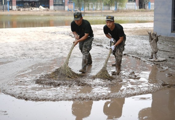 قوات من الشرطة المسلحة الصينية تقوم بأعمال التنظيف بعد الفيضانات في مقاطعة خبي