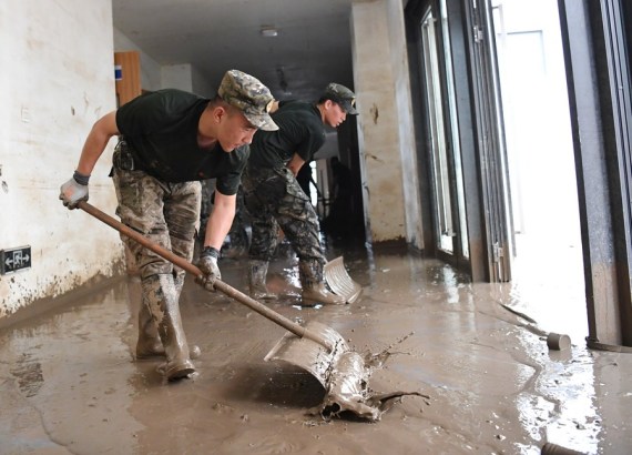 في الصور الملتقطة أفراد من قوات الشرطة المسلحة الصينية يعملون على تنظيف المخلّفات التي نجمت عن الفيضانات في مبنى بمدرسة ثانوية في تشوهتشو بمقاطعة خبي في شمالي الصين، بعد العواصف المطيرة التي تسبب بها الإعصار “دوكسوري”.