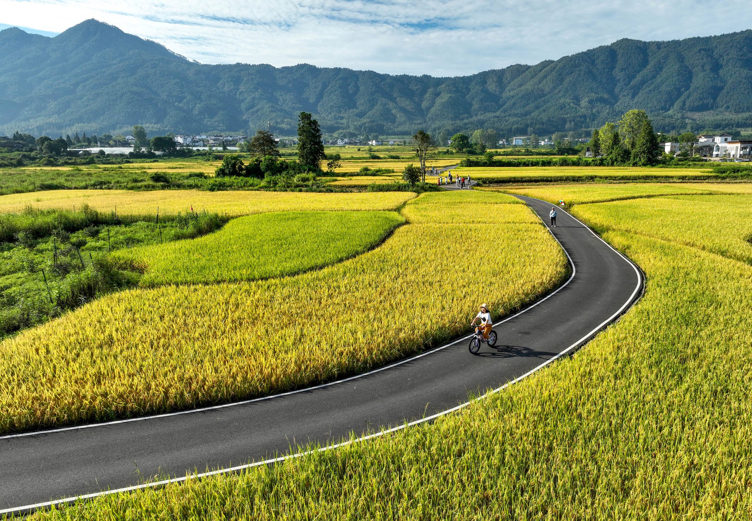 في الصورة الملتقطة سائح يركب دراجة بالقرب من قرية قوانلو القديمة بمدينة هوانغشان بمقاطعة آنهوي في شرقي الصين.