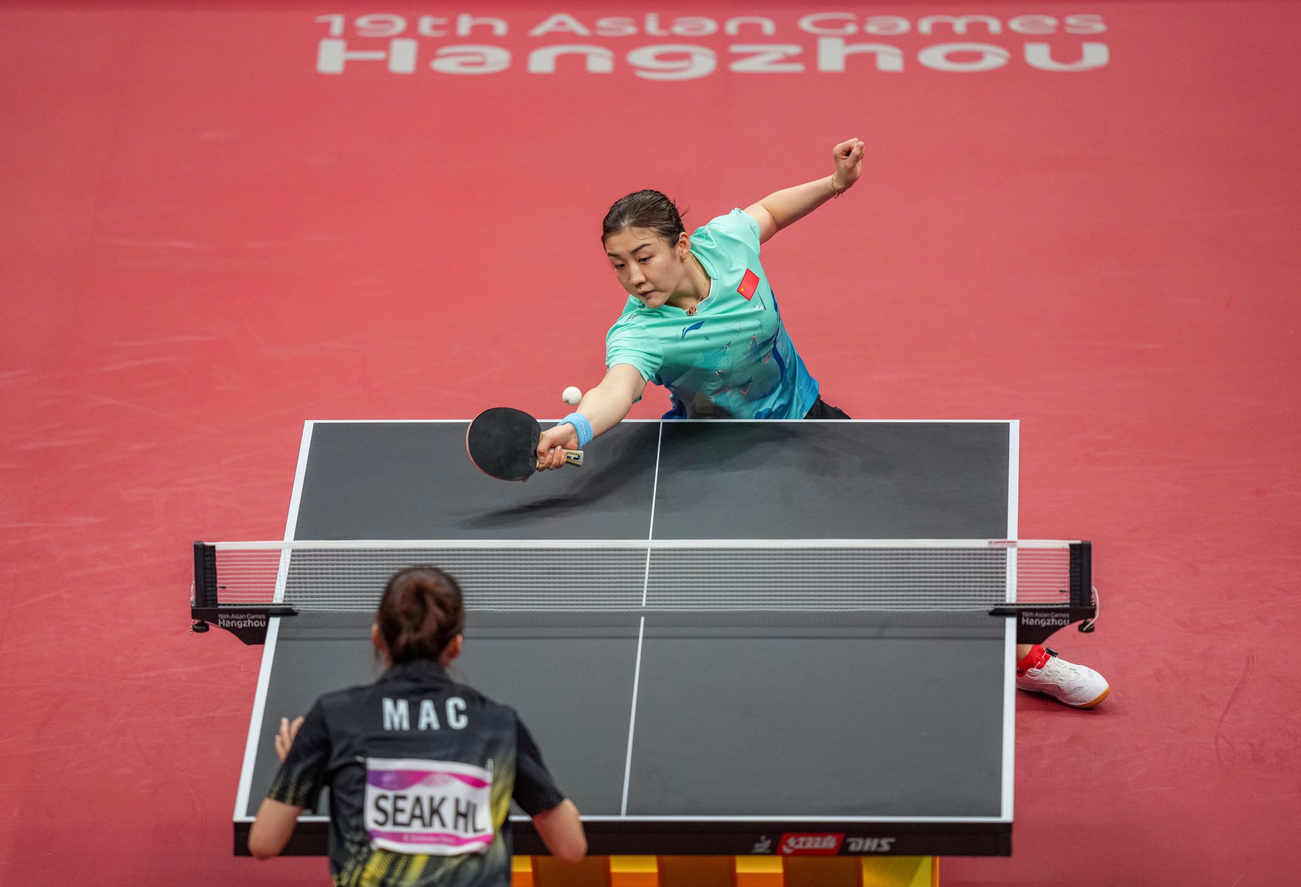 في الصورة الملتقطة تشن منغ (أعلى) من الصين تعيد الكرة إلى سيك هوي لي من ماكاو الصينية، خلال مباراة المجموعة التمهيدية الأولى لفرق كرة الطاولة للسيدات بين الصين وماكاو الصينية في دورة الألعاب الآسيوية الـ19 في مدينة هانغتشو بمقاطعة تشجيانغ في شرقي الصين.