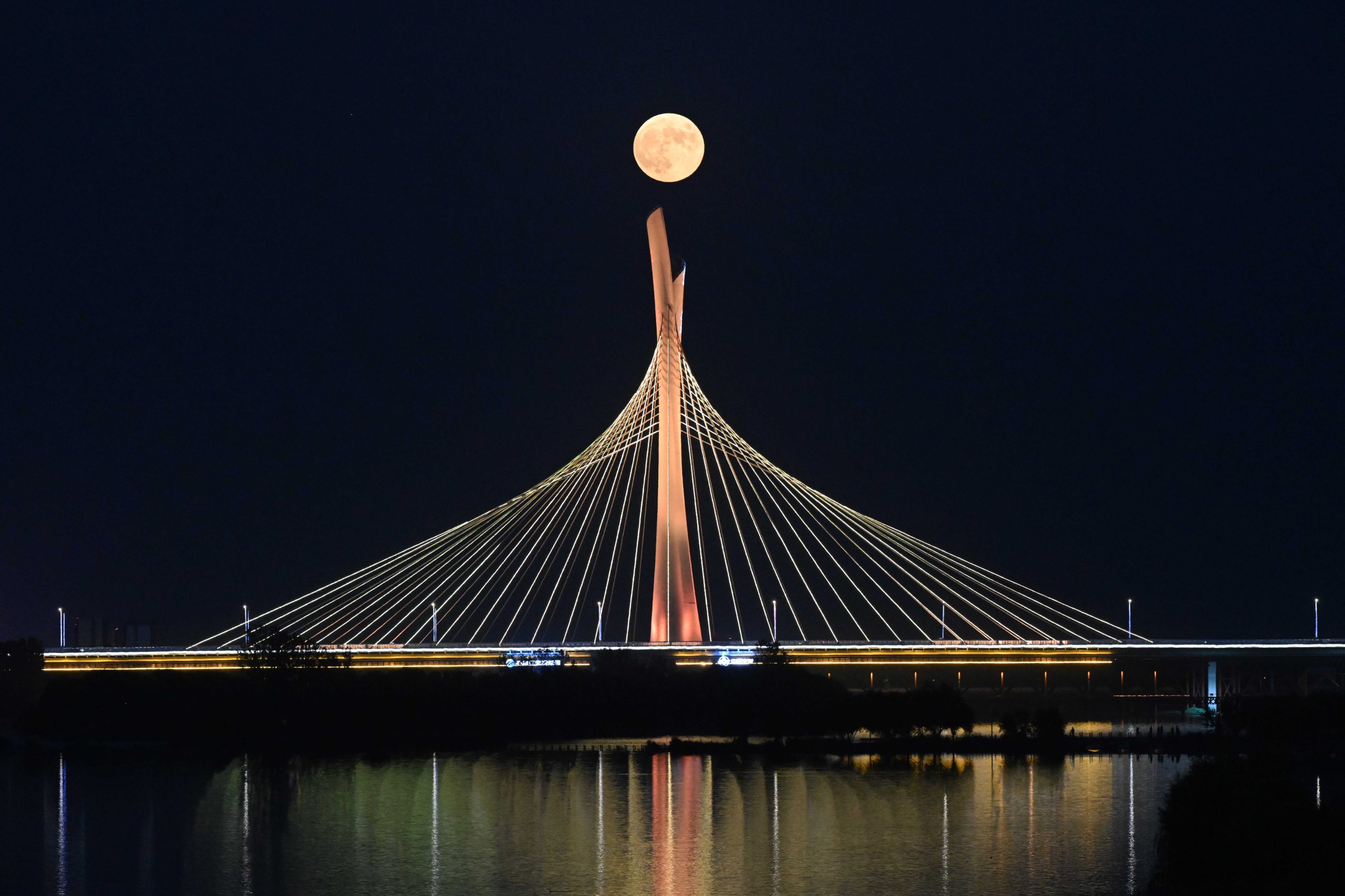 في الصورة الملتقطة منظر البدر فوق جسر نهر هوتوه الكبير في مدينة شيجياتشوانغ، حاضرة مقاطعة خبي بشمالي الصين.
