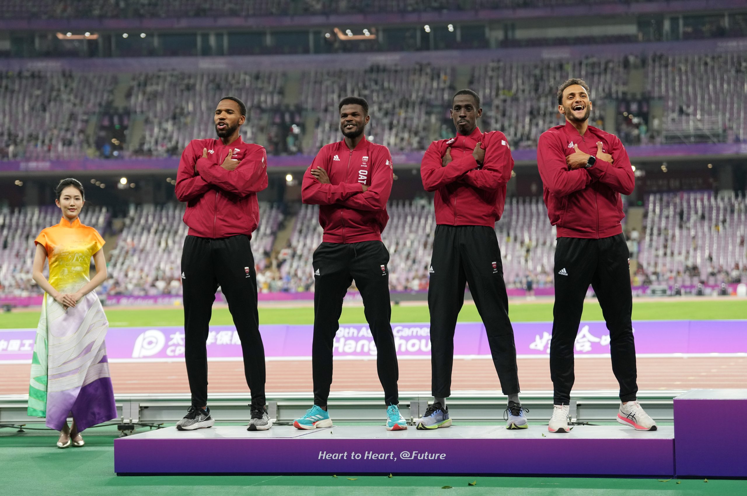 فريق قطر الحاصل على الميدالية الفضية في سباق التتابع 4 × 400 بمنافسات ألعاب القوى في آسياد هانغتشو