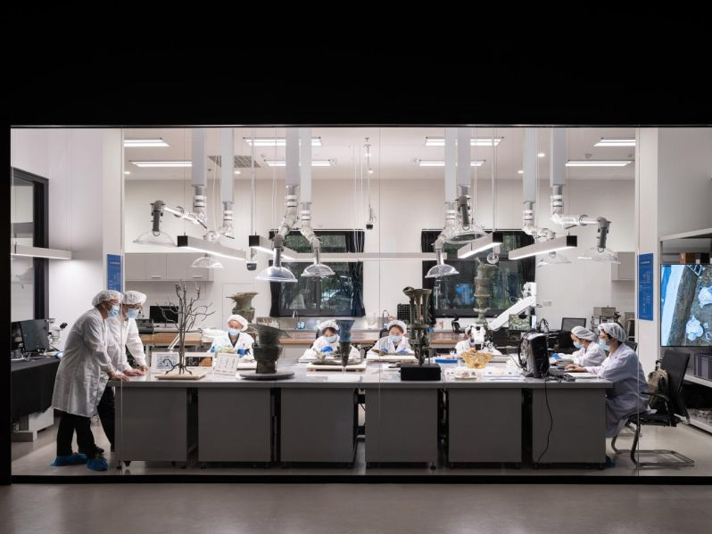 استخراج الآثار الثقافية هو أيضا عمل تقني. يأخذ أعضاء فريق التنقيب عن الآثار أولاً عينات من التربة والمواد اللاصقة بها والتي لها صلة وثيقة بالآثار الثقافية، ويختبرونها ويحللون حموضتها وقلويتها، والأملاح التي بها القابلة للذوبان ومحتوى الرطوبة إلى غير ذلك من المؤشرات الأخرى، مما يوفر أساسًا مرجعيًا لاستخراج الآثار الثقافية وحفظها لاحقًا. ولضمان عدم تلف الأوعية البرونزية الكبيرة أثناء الاستخراج، تم استخدام تقنية الطباعة ثلاثية الأبعاد لأول مرة لطباعة غلاف واقٍ من السيليكون يناسب تماما شكل الوعاء المستخرج.