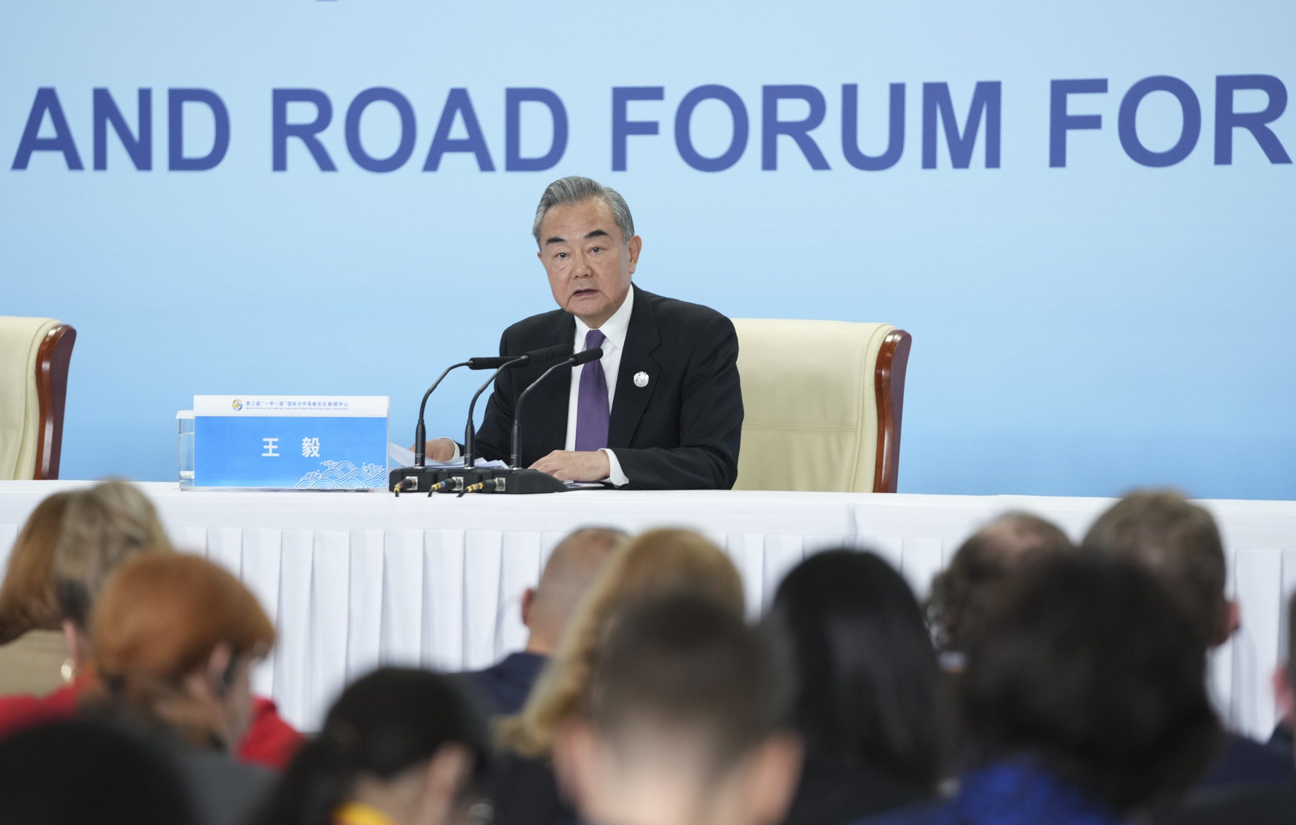 في الصورة الملتقطة وزير الخارجية الصيني وانغ يي، وهو أيضا عضو المكتب السياسي للجنة المركزية للحزب الشيوعي الصيني، يحضر مؤتمرا صحفيا للدورة الثالثة لمنتدى الحزام والطريق للتعاون الدولي في العاصمة الصينية، بكين.