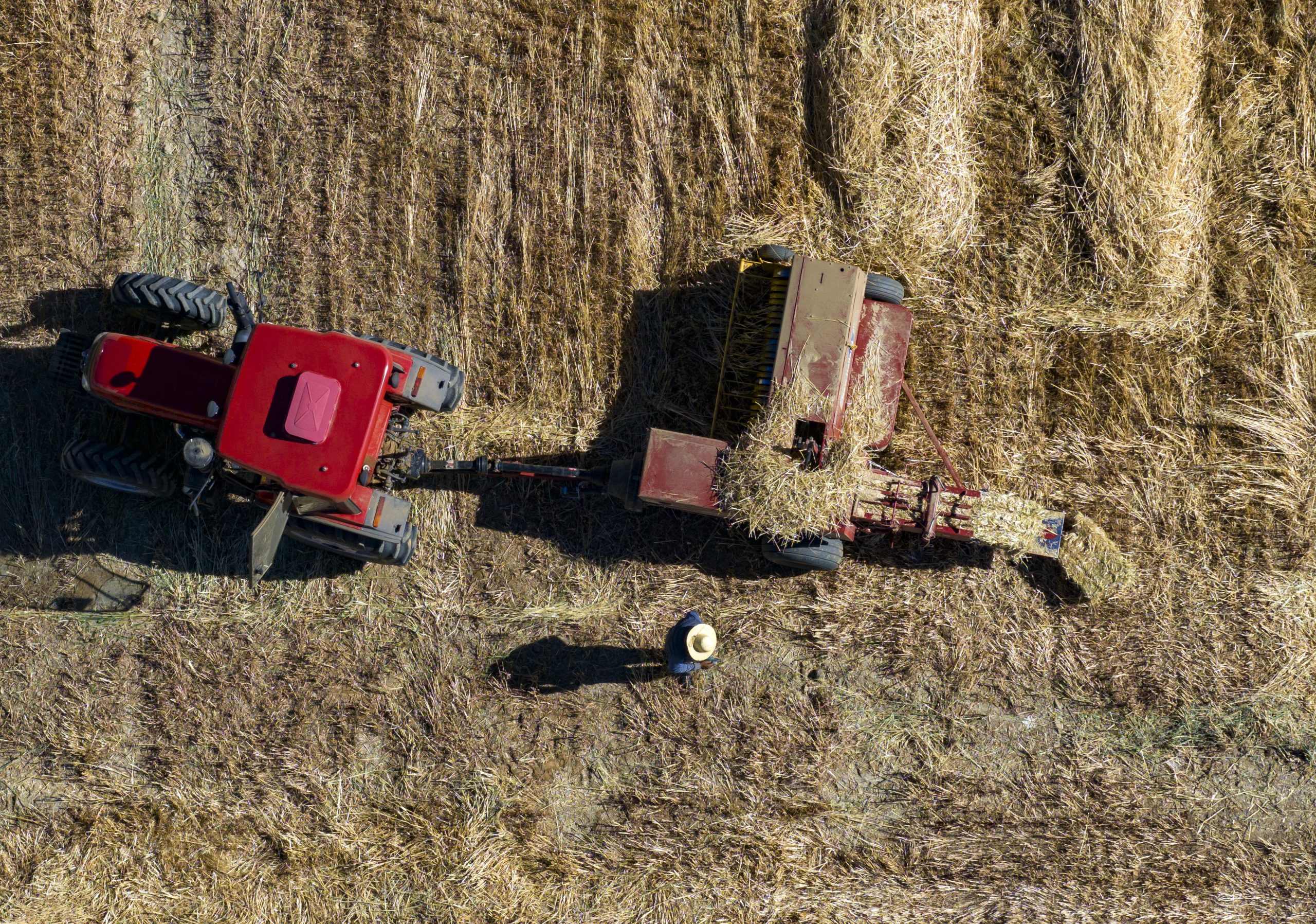 في الصورة الملتقطة بواسطة طائرة بدون طيار، مشهد لحصاد المراعي المزروعة بالعلف العشبي في محافظة لينتشو التابعة لمدينة لاسا، حاضرة منطقة التبت ذاتية الحكم جنوب غربي الصين، حيث تم زراعة 565.7 ألف مو (حوالي 37.7 ألف هكتار) بالعلف العشبي في عموم المنطقة حتى يوم 15 أكتوبر الحالي.