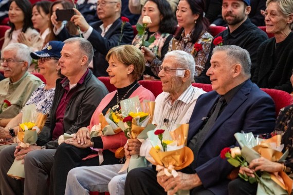 قدامى محاربي النمور الطائرة وأقاربهم وأعضاء مؤسسة تراث الطيران الصيني-الأمريكي يشاهدون عرضا في مدرسة كونمينغ للغات الأجنبية في كونمينغ بمقاطعة يوننان جنوب غربي الصين، في 3 نوفمبر 2023.