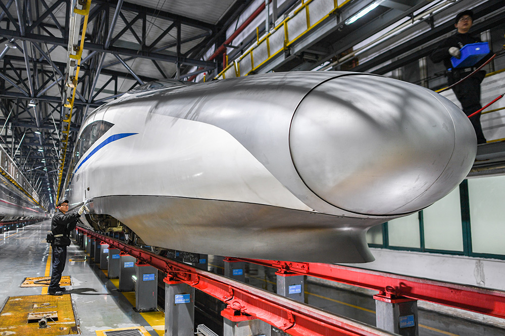 في الصورة الملتقطة ميكانيكيون يفحصون قطار الطلقة داخل قاعدة للصيانة في ووهان بمقاطعة هوبي بوسط الصين.