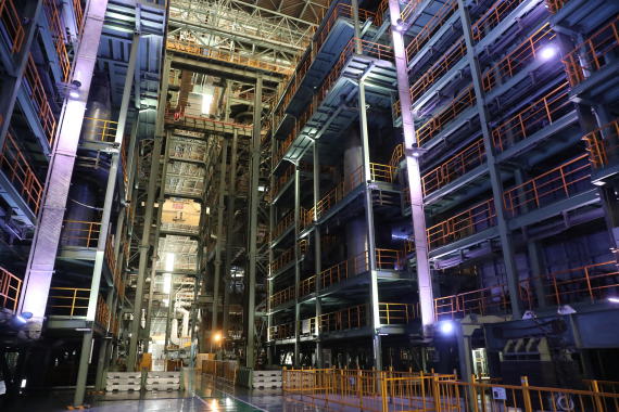إن التجول في ورشة الدرفلة على البارد في شركة باوستيل في شانغهاي يشبه الدخول إلى غابة فولاذية داكنة.