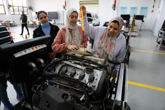 وانتشر الطلبة والمتدربون بمرافقة الفنيين والمدربين في أنحاء الورشة في مجموعات حول الأجهزة والمعدات التعليمية والتدريبية، يتدربون عمليا وبأيديهم على أحدث المعدات في مجالات السيارات والطاقة الجديدة والمتجددة والتحكم.