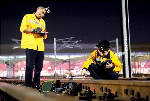 في الصور الملتقطة عمال يقومون بأعمال الفحص والصيانة الشاملة لأنفاق السكك الحديدية فائقة السرعة في محطة تشنغتشو الشرقية في منتصف الليل، وذلك لضمان التشغيل الآمن للقطارات المزدحمة خلال عطلة عيد قوارب التنين التقليدية الجارية.