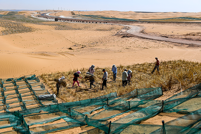في الصورة الملتقطة جوا عمال يقومون بزراعة مربعات القش بالقرب من جزء من الطريق السريع في صحراء تنغر في تشونغوي بمنطقة نينغشيا ذاتية الحكم لقومية هوي بشمال غربي الصين.