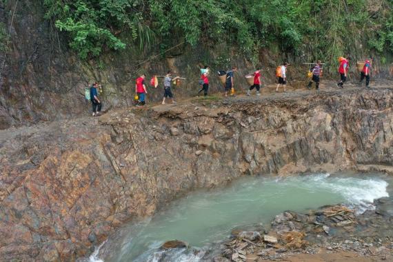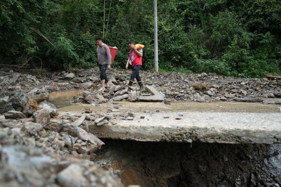 في الصور الملتقطة يوم متطوعون يقومون بتوصيل الإمدادات للسكان المحليين المتضررين من الأمطار الغزيرة في بلدة ييوانغشي بمدينة تشانغده في مقاطعة هونان بوسط الصين، حيث تسببت الأمطار في حدوث انهيارات أرضية في 388 موقعا وألحقت ضررا واسع النطاق بالطرق والجسور في بلدة ييوانغشي.